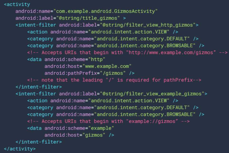 - CATEGORY_DEFAULT and CATEGORY_BROWSABLE attribute in order to move a user from a browser to the application.