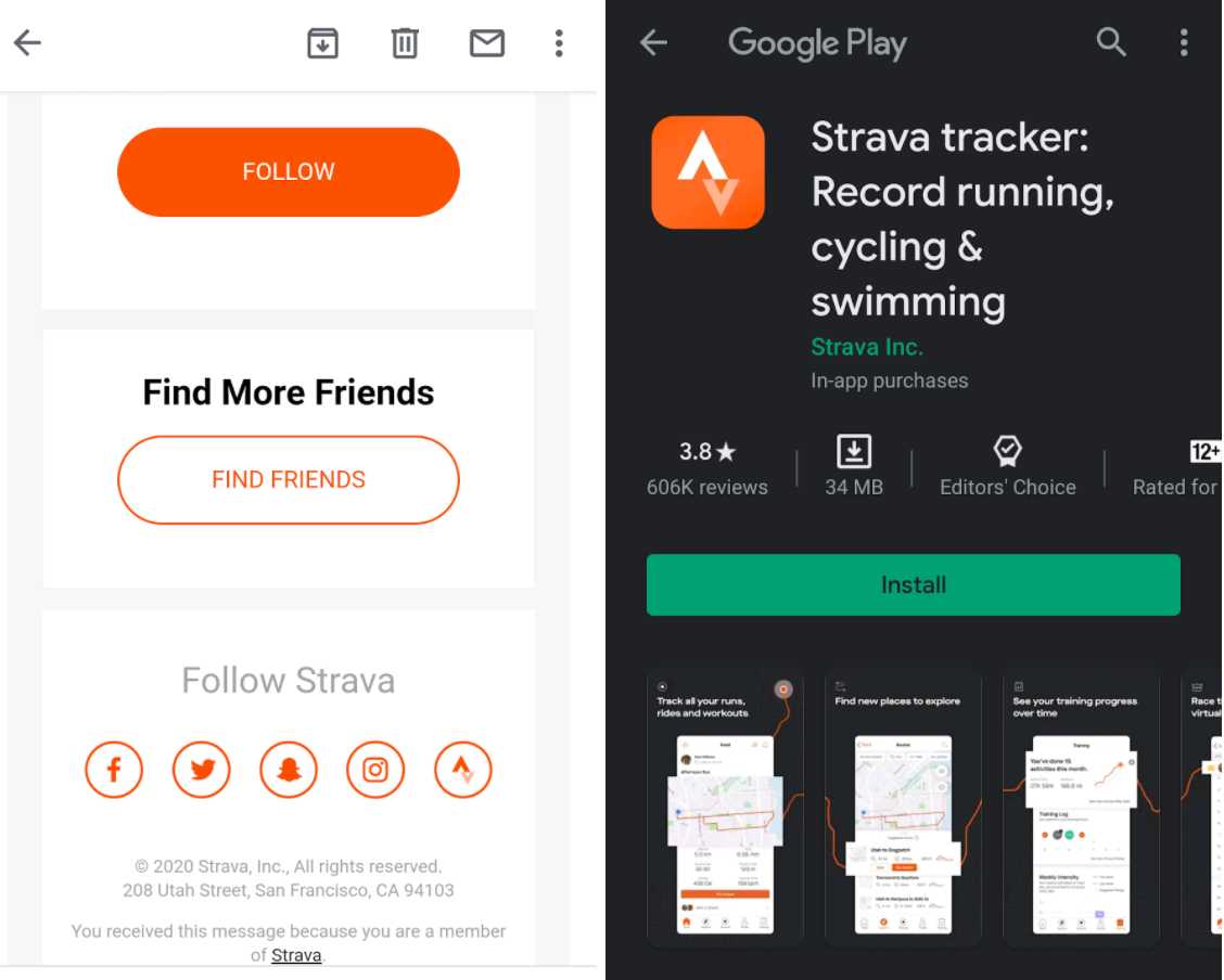 When clicking on the CTA, users are redirected to the appropriate app store to download the app, if not installed. Then after the log-in, the user is forwarded to the app section to connect with friends – an example of deferred deep linking.