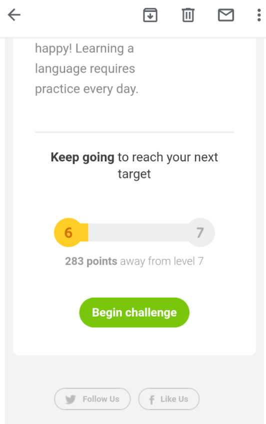 Another example of deferred deep linking. By clicking on the CTA of email from Duolingo, users are redirected to a particular lesson.
