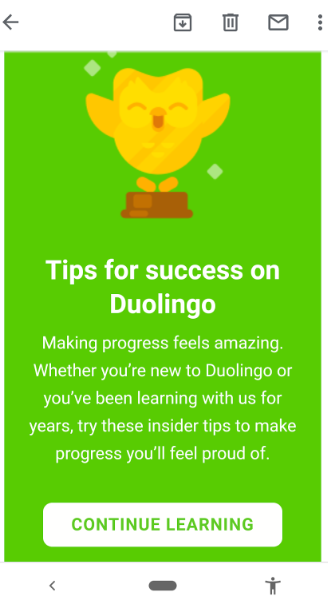 Even after your app’s release, email marketing is a useful tool to retain users. Here’s an example from the Duolingo app.