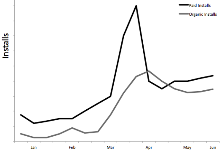 How a successful burst campaign can impact organic app installs in the long term. Image Credits: tune.com