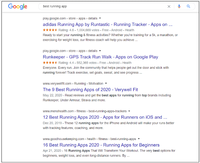 Searching for “best running app” in Google shows running apps in the Play Store.