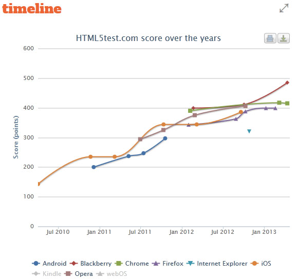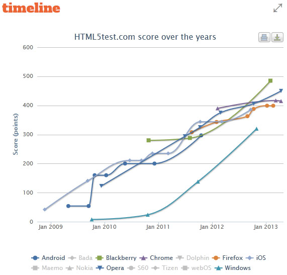 Smartphone browsers: Out of a maximum score of 500 for the HTML5 test, the latest Blackberry 10 platform mobile browser performs the best (485 points), followed by Opera, Chrome and Firefox.