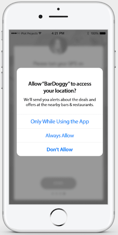 The location opt-in prompt on iOS 11. Image Credit: plotprojects.com
