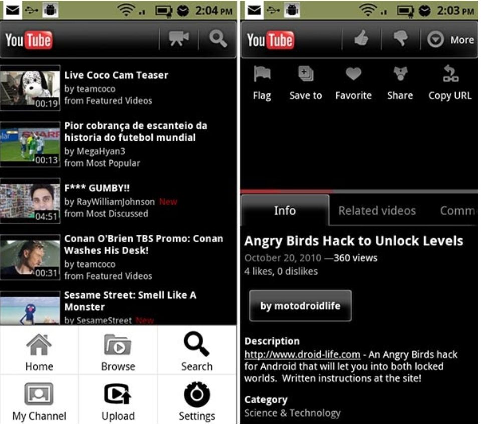 YouTube app’s UI in 2010. Image Credit: androidweblog.org