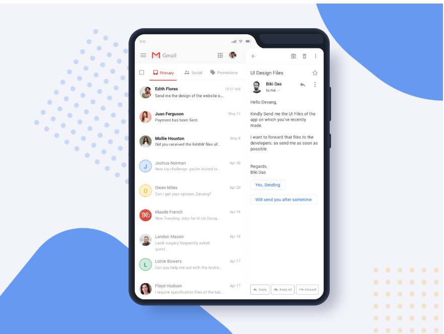 Gmail app UI in foldable devices by Devang Dave. Image Credit: dribbble.com