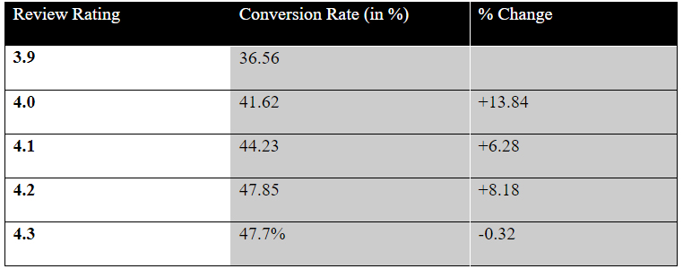 In a study published by Paul Medrano in Noteworthy Journal Blog, the author reported a rise in app conversion rate with the increase in mobile app review ratings.