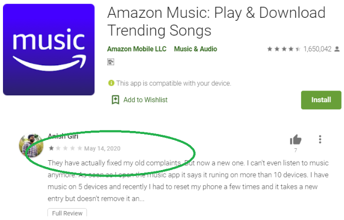 Though the user has still rated the app low, Amazon Music still retains its positive reputation due to the credit given by the user in fixing earlier issues.