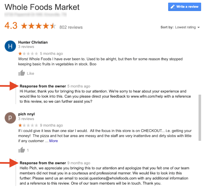 The screenshot below shows the response of a whole foods market seller to negative customer reviews: