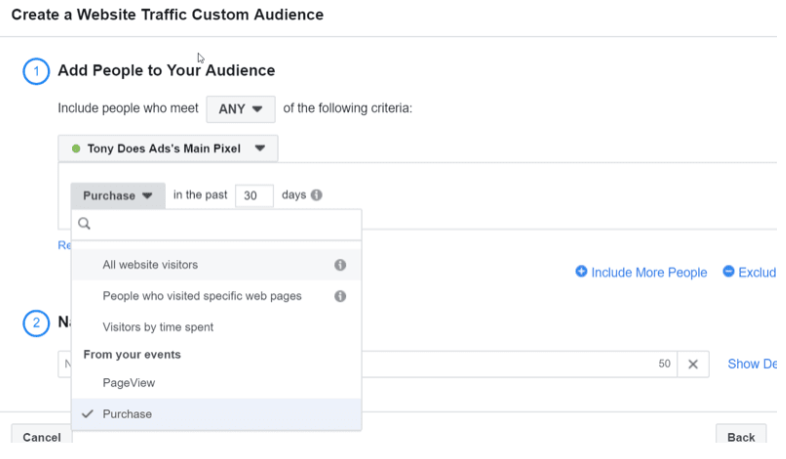 After that, you can create a custom audience based on their actions on your website, and also lookalike audience (they aren’t your customer, but have similar browsing habits to your custom audience).