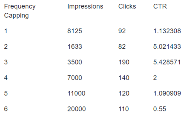 The table measures how the CTR changes with increasing frequency cap for a company. After a lot of experimenting, they found out that a frequency capping of three works the best for them.